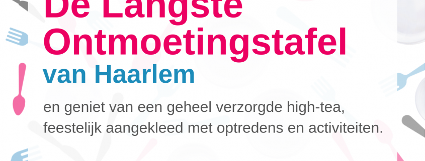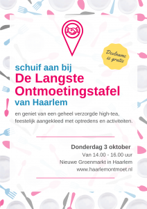 Op donderdagmiddag 3 oktober aanstaande kunnen Haarlemmers aanschuiven aan de Langste Ontmoetingstafel in het centrum van de stad op de Nieuwe Groenmarkt. Iedereen is welkom tijdens een geheel verzorgde high-tea die feestelijk wordt aangekleed met optredens en toegankelijke activiteiten. Meedoen is gratis, elkaar ontmoeten, samen eten en sociaal contact staan centraal.