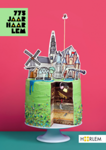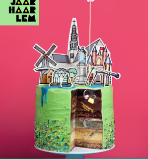 Het concept: Hier zien we een heerlijke taart met de iconische figuren van Haarlem er bovenop. We hebben er alvast een punt uitgehaald en dan zie je dat de taart de stad Haarlem symboliseert. De taart is namelijk opgebouwd uit 775 jaar grondlagen van Haarlem.
