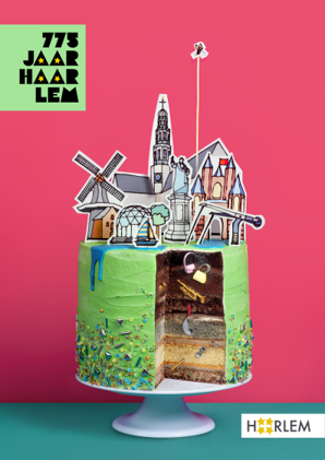 In de grondlagen van de taart zien we voorwerpen die op een feestelijke manier tot leven zullen komen!  Zoals een glas waarmee geproost wordt door de burgemeester, een trompet die de Haarlem toost aankondigt en de winkeltasjes die symbool staan voor de winkelactie (retailactie).