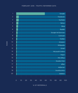 Je kent het gezegde: ‘Alle wegen leiden naar Rome’. Online geldt dat gezegde voor Google. Van al het verkeer op internet begint 60% daar. Je kunt dus simpelweg niet om Google heen. In het plaatje hieronder zie je de dominantie van Google heel duidelijk naar voren komen.