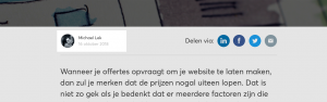 Jouw expertstatus en die van je team kun je op de ‘Over ons’ pagina van je website claimen. Laat zien wie het team is en geef een korte beschrijving van ieders expertise. De ene kan bijvoorbeeld een absolute master zijn in een bepaalde productcategorie en de ander is weer helemaal thuis in iets anders. Vraag je teamleden ook om een LinkedIn-profiel aan te maken als ze dit nog niet hebben. Op hun profiel kunnen ze dan hetzelfde verhaal delen en zo hun expertstatus extra kracht bij zetten.