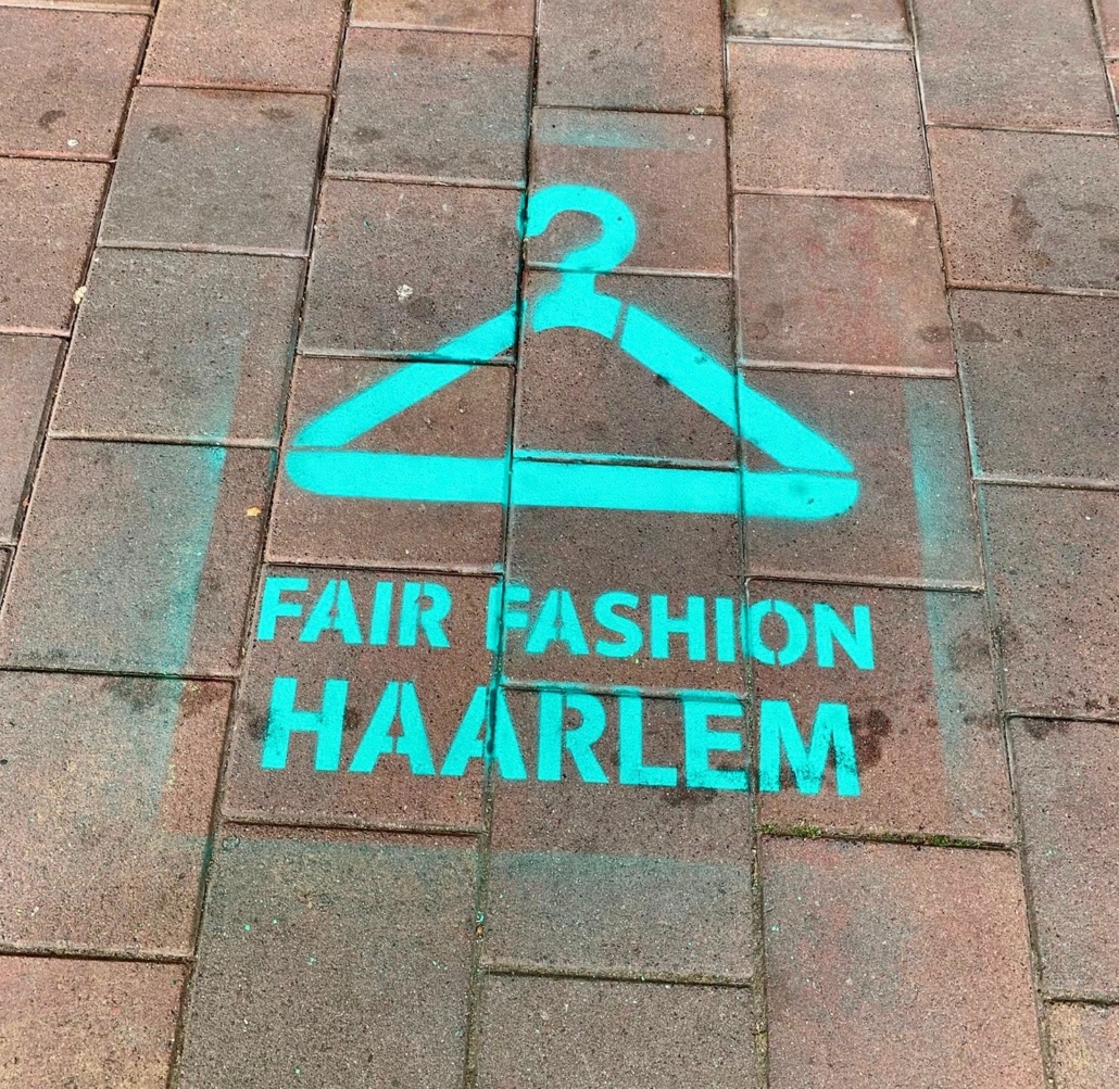 De groene kledinghangers laten zien welke winkels er deelnemen aan de Fair Fashion winkelroute. Dit maakt het voor bezoekers makkelijk en toegankelijk om te zien welke ondernemers er betrokken zijn. De kledinghangers zijn op de stoep gespoten met duurzaam krijt, met veel regen kan het zijn dat de kledinghangers worden weggespoeld. Maar dan is er altijd nog de winkelroute kaart met alle adressen: Fair Fashion Haarlem | oktober – november 2024 (fairfashion-haarlem.nl)