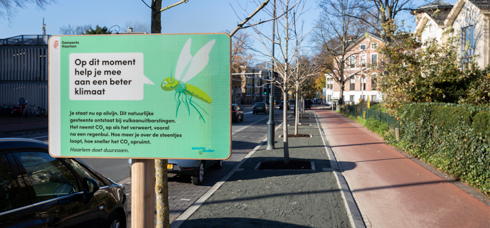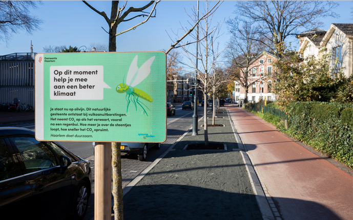 Sinds deze week ligt er olivijn op de Kiss & Ride-strook achter het station. Het olivijnpad neemt CO2 op uit de lucht. Het gebruik van dit mineraal in wandelpaden is een idee van de Haarlemse Jelle Brans en Maarten Hulsman. Zij wonnen in 2019 het Initiatievencafé dat in het teken van het Haarlems Klimaatakkoord stond.
