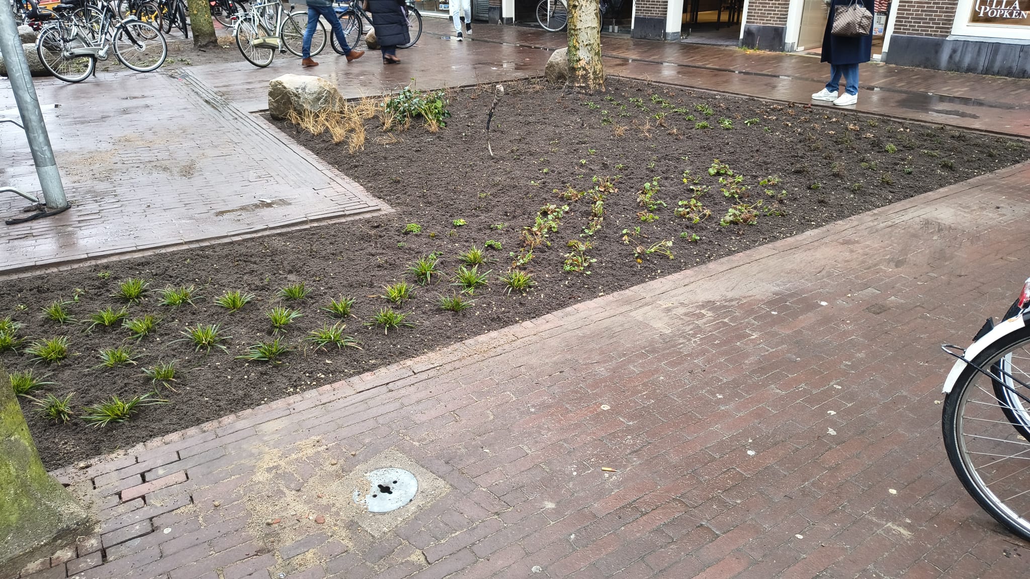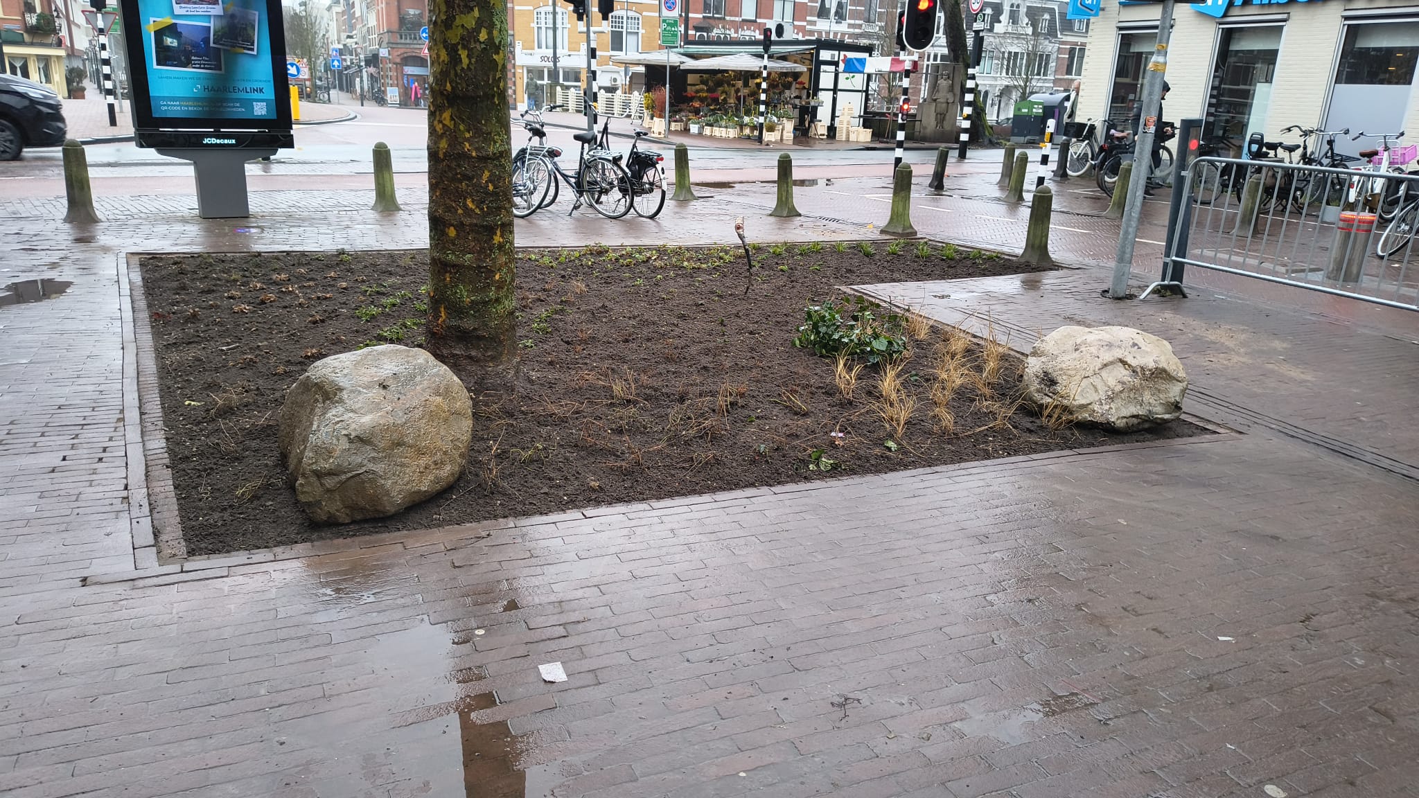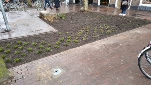 Rondom de boomspiegels zijn grote keien geplaatst, om te voorkomen dat auto’s of fietsers er doorheen rijden. Wanneer de fietsenrekken zijn teruggeplaatst, zorgen ook deze voor afscherming van de vakken. Daarin komen overigens de eerste planten al op en Jeroen vertelt dat er is gekozen voor planten die snel groeien, zodat het resultaat van de vergroening dit voorjaar al goed te zien is. “We hebben dit gedaan in samenwerking met Hoveniersbedrijf 023Tuinen, die weten exact welke beplanting geschikt is voor een gebied als dit, waarbij het ook van belang is dat het onderhoud beheersbaar is.”