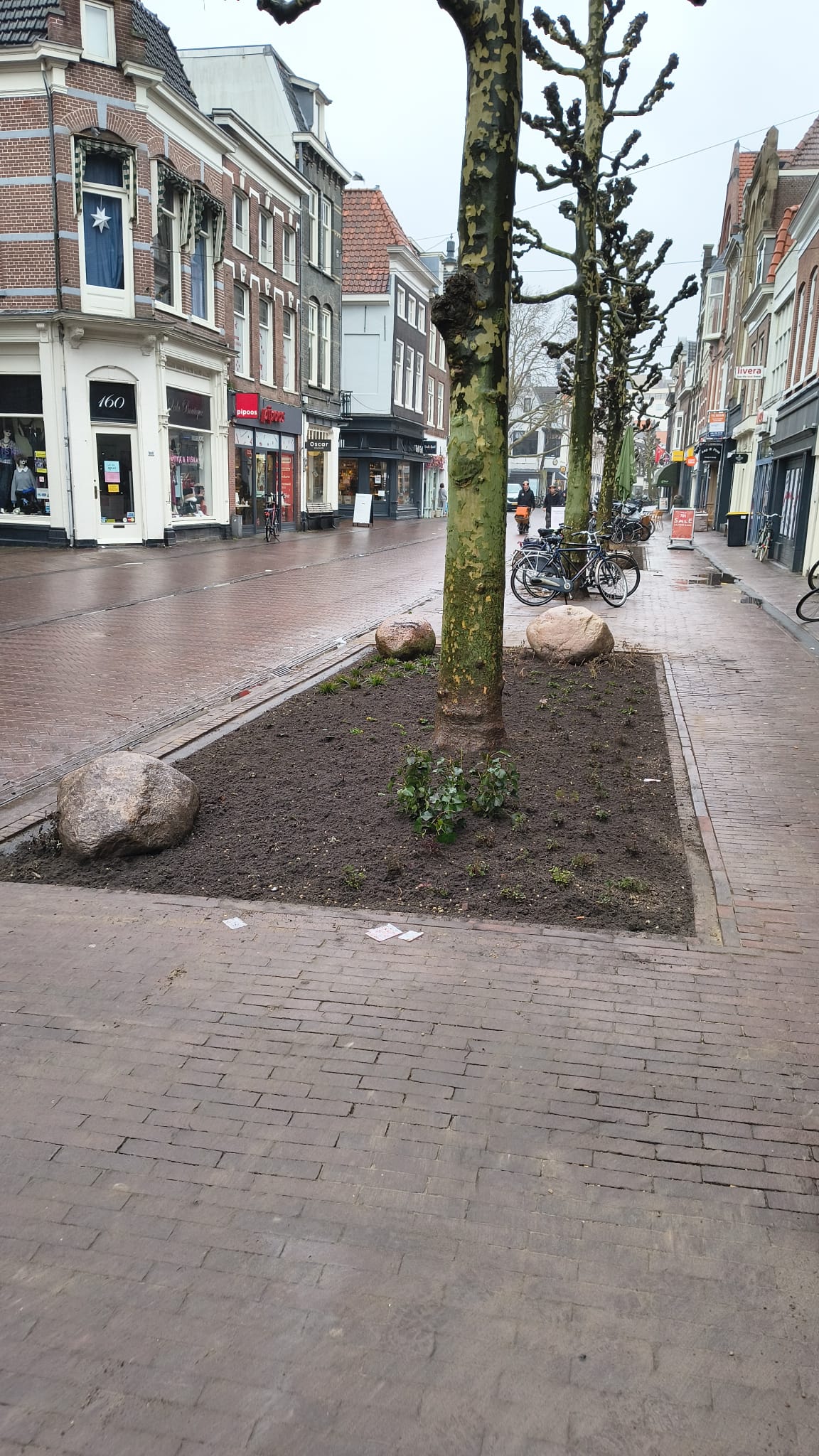 Eén van de meest in het oog springende is het toevoegen van groen door rondom bestaande bomen zes boomspiegels toe te voegen. Stenen eruit, planten erin dus. Jeroen: “Dat helpt bij het sneller afvoeren van regenwater en draagt bij aan het terugdringen van hittestress. Daarnaast geeft het een veel fraaiere en vriendelijkere uitstraling. Uit onderzoek weten we dat het toevoegen van groen eraan bijdraagt dat voetgangers vertragen. Dat vergroot de kans dat mensen even in een etalage kijken of bij een winkel binnenlopen, wat op den duur hopelijk bijdraagt aan minder leegstand. Bij dit alles hebben we er uiteraard rekening mee gehouden dat er genoeg ruimte overblijft voor laden en lossen, hulpdiensten, enzovoort.”