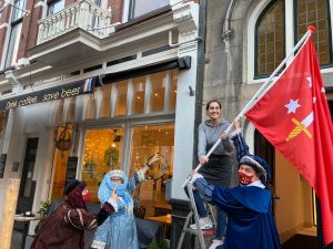Afgelopen twee weken hebben Graaf Willem II, Floris V en gevolg in de binnenstad van Haarlem vlaggen uitgedeeld aan de ondernemers. Om de verjaardag van Haarlem te vieren is iedereen gevraagd deze vanaf moment van uitdelen te vlaggen aan de gevel of deze te gebruiken als attribuut in de etalage. Op deze manier gaat de stad er mooi uitzien en vieren we corona-proof dat de stad jarig is. In overleg met de gemeente Haarlem mag de vlag de hele maand november en december blijven hangen, zonder dat hier precariorechten voor gerekend worden.