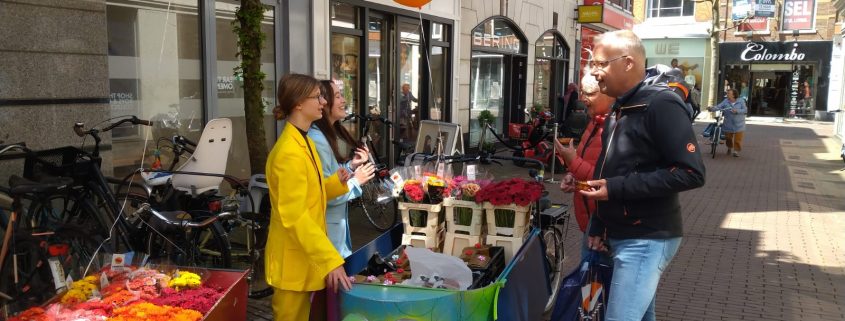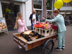 De Haarlemse shop fans zijn verrast met bloemen (5000 gerbera’s) en daarnaast geluksdoosjes waarbij de lekkernijen (2000 stuks) zijn ingekocht bij 40 ondernemers in de binnenstad.